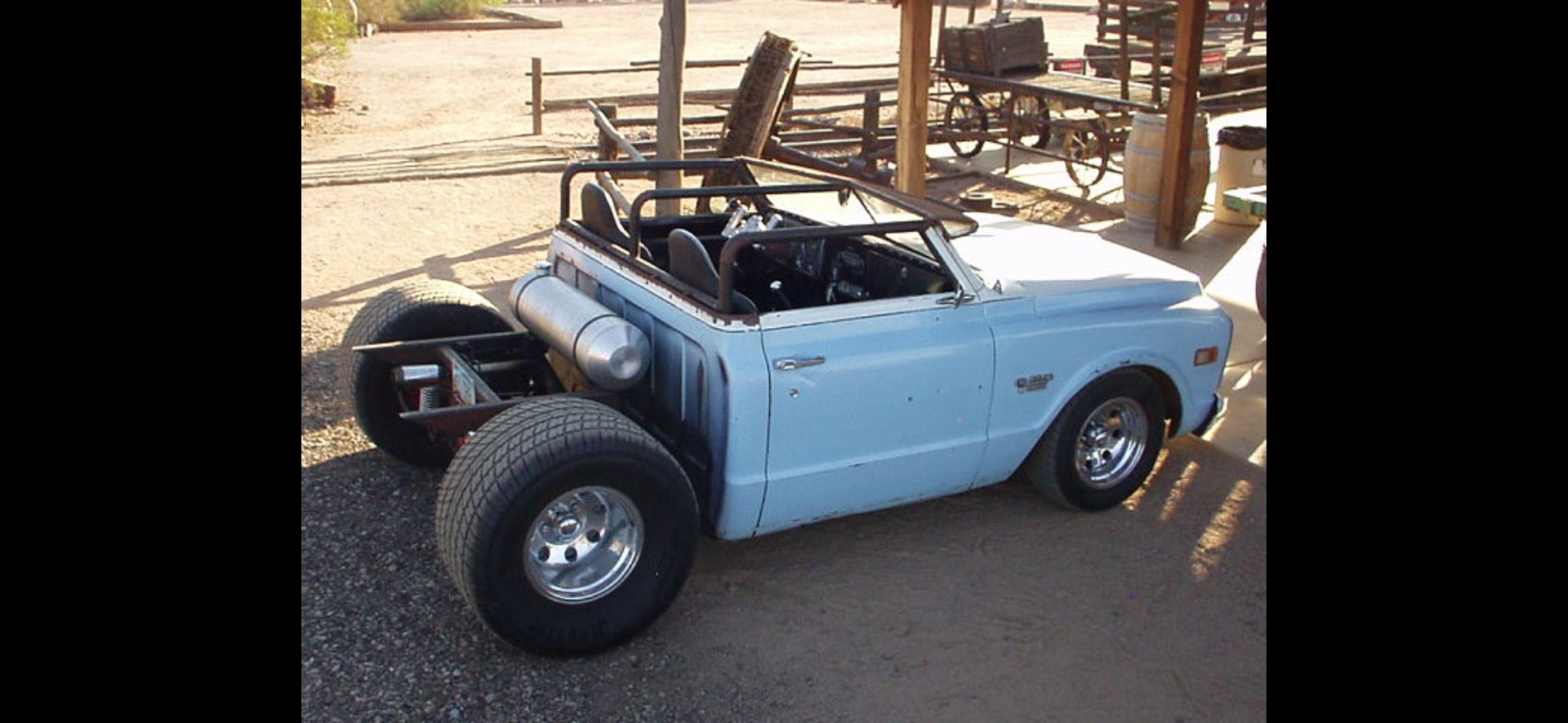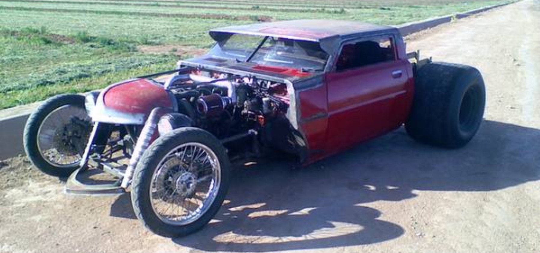 Diesel powered, the front of the hood became the visor, I chopped and sectioned the roof, took an old 37 international water truck grill, that I found in the desert and shortened it up about 13" and cut into multiple pieces, then leaned it all back and raked it out and then rewelded it.
