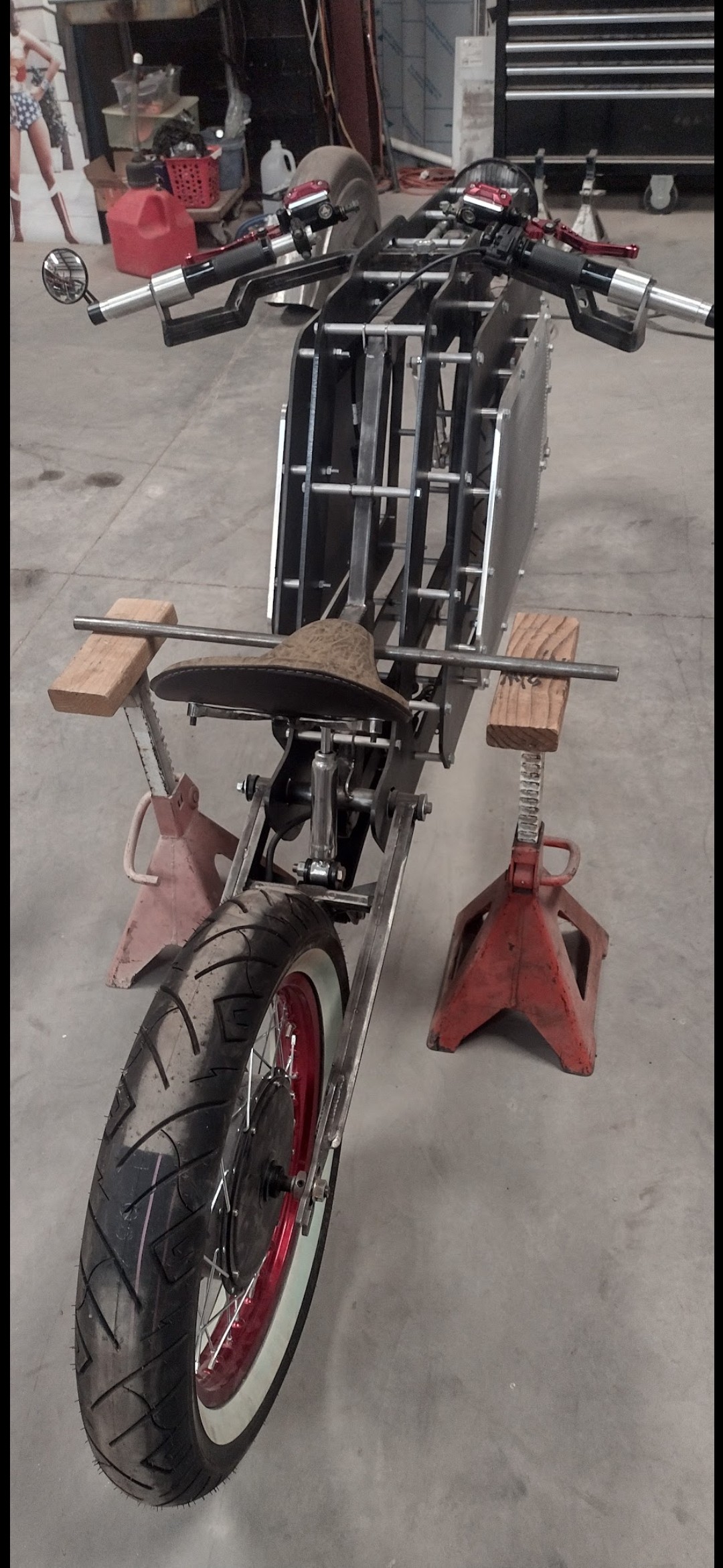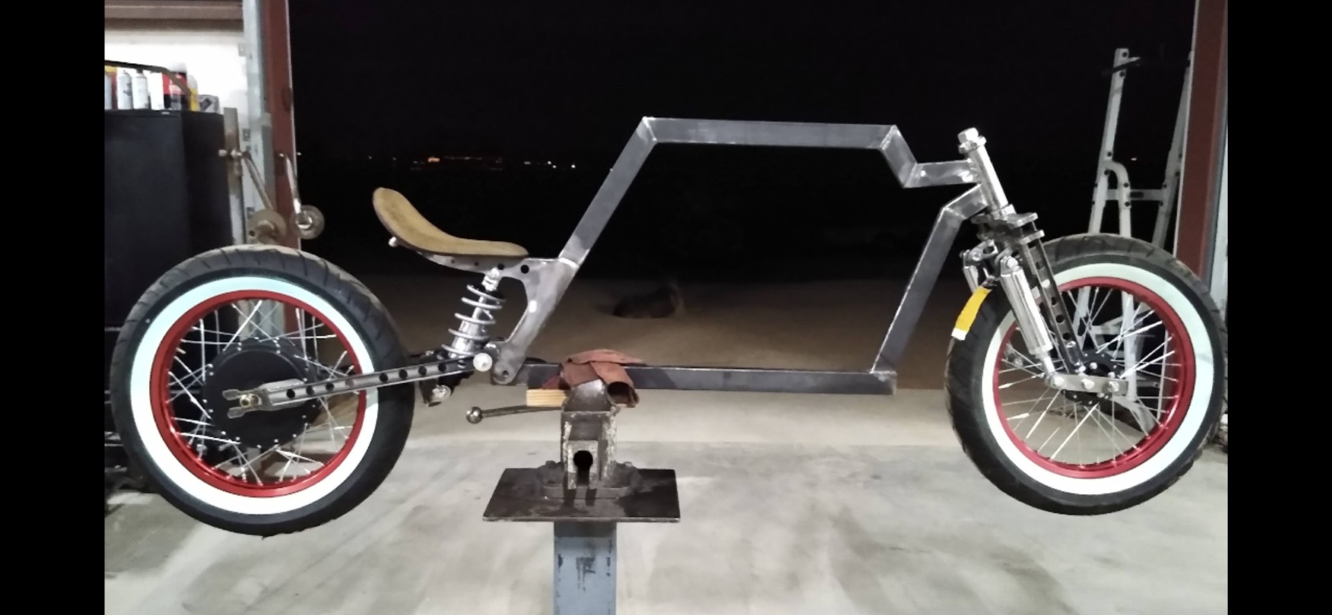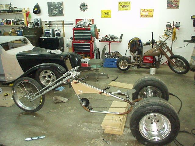I took an early Chevy beam and some old Kawasaki Wheels (a trick I've used many times) and adapted them all to work together. There's way too much to explain here, but this was a really fun build, on a really tight budget!