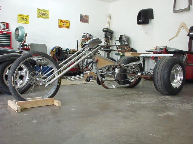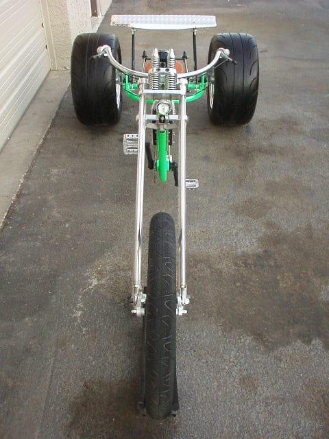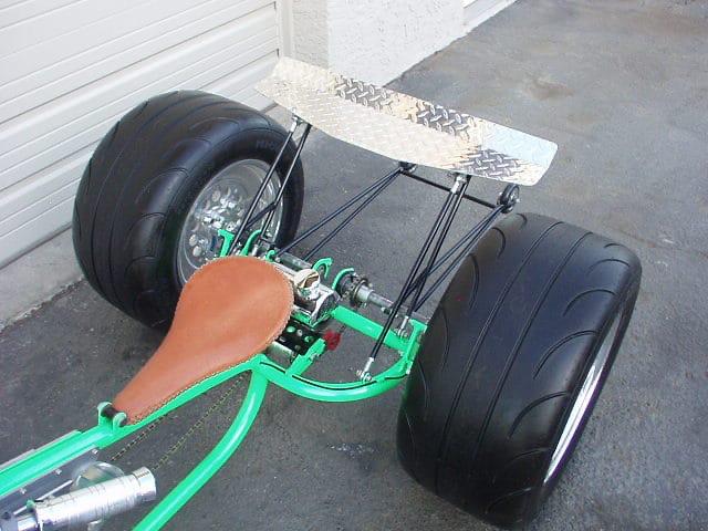 There's a spoiler, wheelie bars, fuel tank, 7-speed Shimano transmission, a billet suicide shifter, air ride, under the custom, hand tooled steel and leather seat, tiny functioning disc brake calipers, in the rear, with ventilated custom rotors. I had to hand make every inch of this trike, from the hubs, to the wheels, to the chassis, to the faux fuel tank, but in the end... it was really worth it!