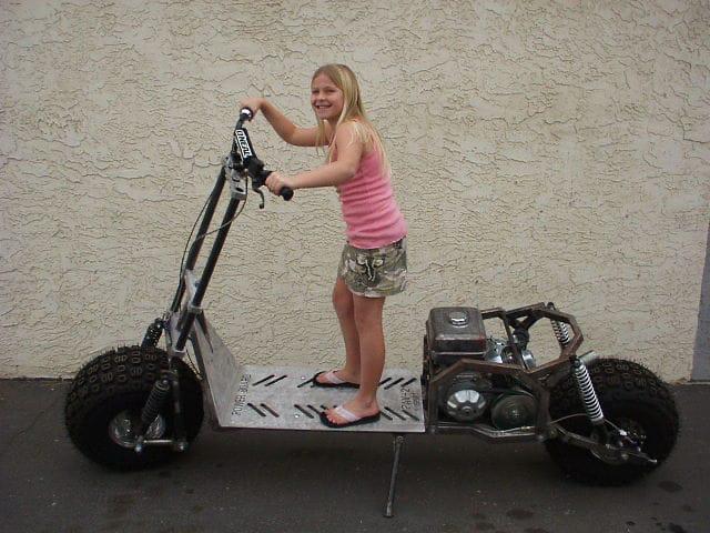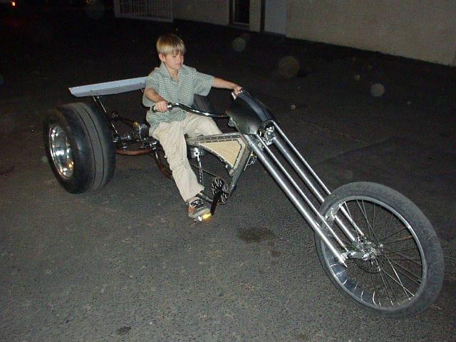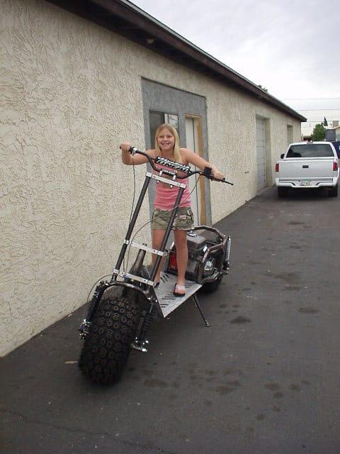 This is the civilian model. It's hard to tell from those pictures, but Josie's 11 or 12 there and that bike is 8 ft long, 15 inches of clearance from the deck, to the ground, 5 ft 7 in tall at the handlebars, the tires are 24 inches tall by 1 ft wide and those ran the "Animal" and the "World Formula" engines and a performance CVT. `